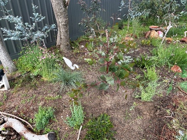 Kate’s garden in Greenwood was originally dominated by introduced species when she moved in, with the exception of two established eucalypts. Over time, she has replaced the non-native plants with native trees, shrubs, and grasses, and added a bird bath along with rocks and logs to provide habitat for reptiles. These features give lizards shelter from predators and encourage them to stay, helping to naturally manage garden pests. For the competition, Kate planted an additional eucalyptus, as well as more grasses, shrubs, and groundcovers — and has since used her prize to purchase even more native plants!