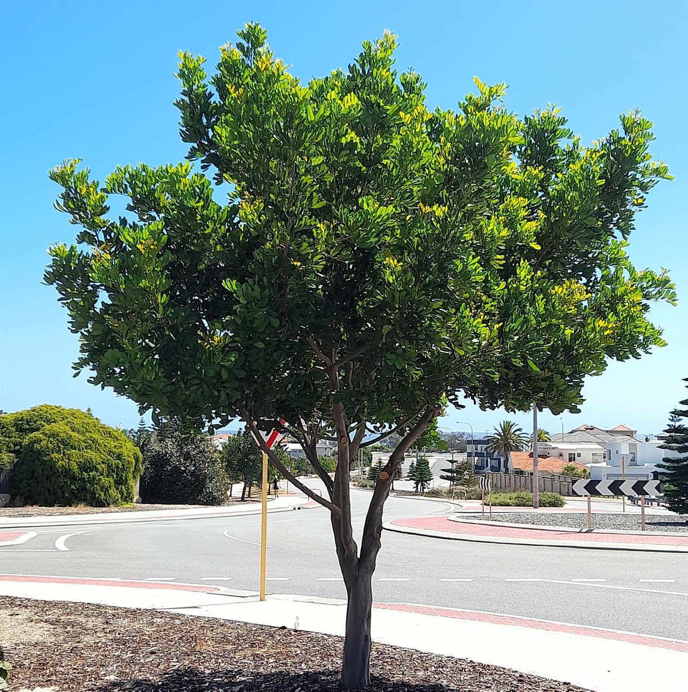 Description: Small to medium tree with a rounded canopy and shiny dark green foliage. Within a streetscape environment the tree can grow between 8 – 10 metres high. The tree has mottled grey bark and produces clusters of creamy white flowers in late summer.