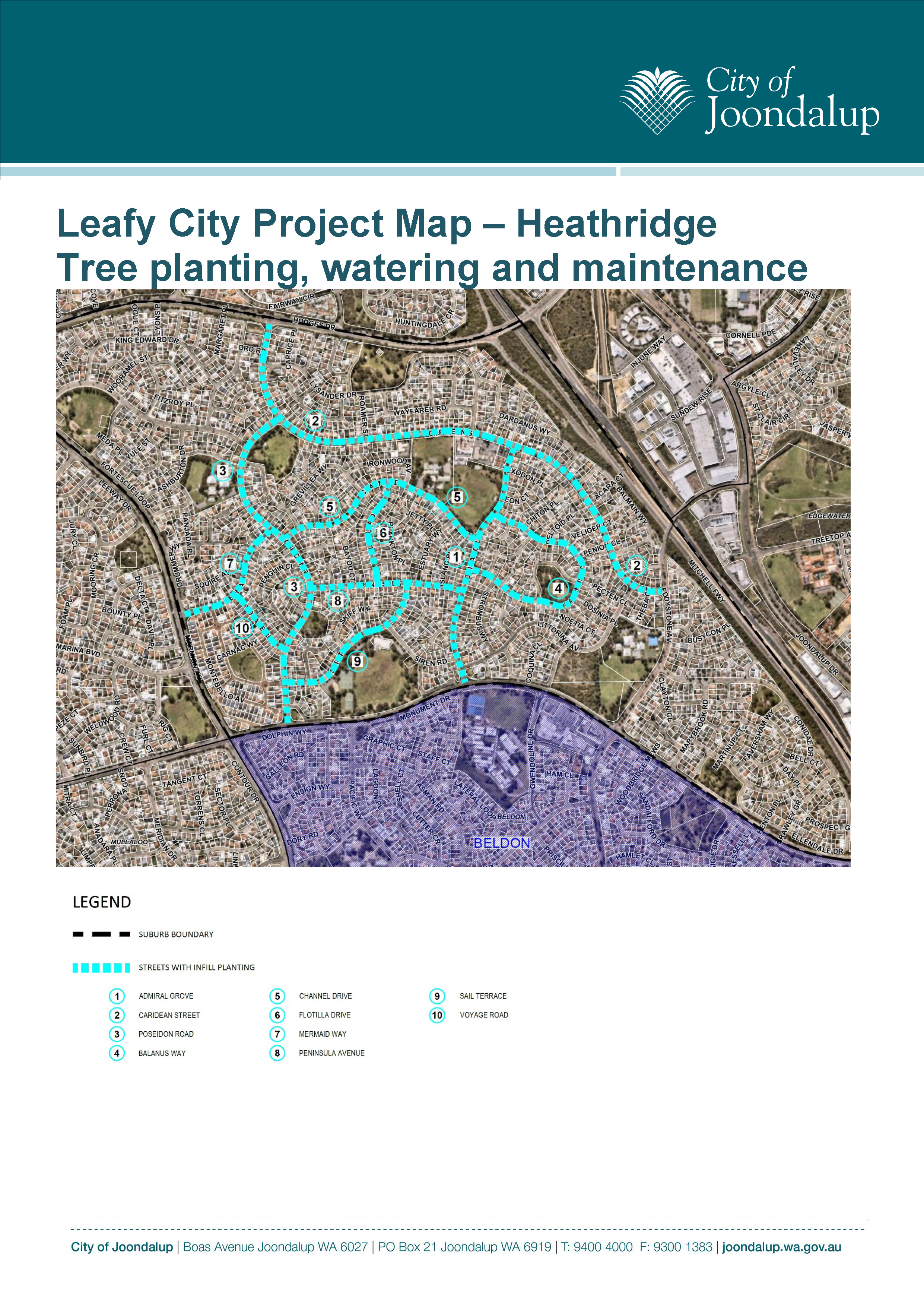 The project sites for 2026 are selected streets in Beldon and Heathridge. At least two weeks prior to the installation date, the proposed location of the tree will be marked on-site, including locations featuring existing ‘hardstand’ surfaces, such as brick paving, concrete, or synthetic turf.