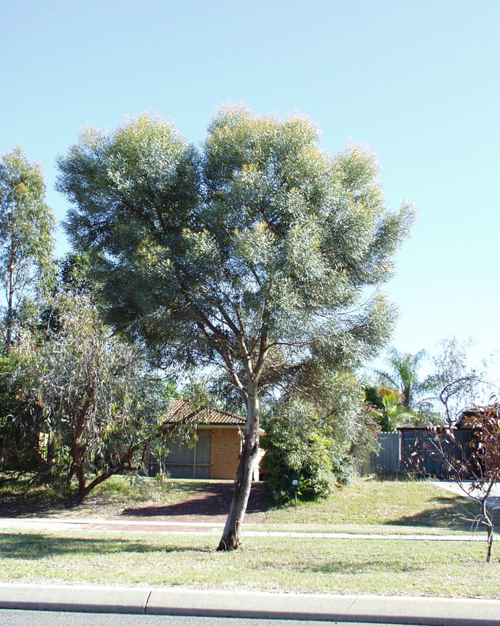 Description: Medium sized tree with long, grey-green tapered leaves which form a good shade canopy. Within a streetscape environment the tree can grow between 5 -12 metres high. The tree has satin-like, grey-brown bark and produces cream flowers from winter to summer.