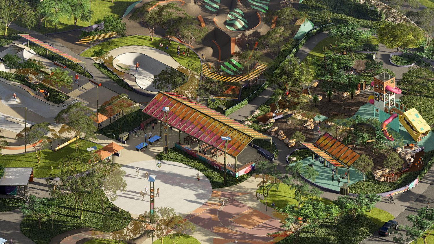 - a signature skate park, including a skate bowl and transition style facility which caters for skill progression
